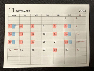 レッスン日程 · 2025/10/11 11月レッスン日のお知らせ♪ こんにちは。千葉市緑区・市原市のリトミック・ピアノ教室りとぴょんです。 先日発表会が終わり、生徒さんたちは教本に戻り、新しい曲を練習し始めました 生徒の皆さん、一生懸命練習すると、ハロウィンにいい事があるかも・・・ そして、 発表会後、皆さんから素敵な贈り物をいただきました お菓子や、心のこもったお手紙をありがとうございました 生徒さん本人からの可愛らしいお手紙や絵も、お母様からのお手紙も大変うれしく読ませていただきました 毎日の励みになります 11月レッスン日です。 グループレッスンの方・・・青 個人レッスンの方・・・ピンク tagPlaceholderカテゴリ: コメントをお書きください コメント: 0